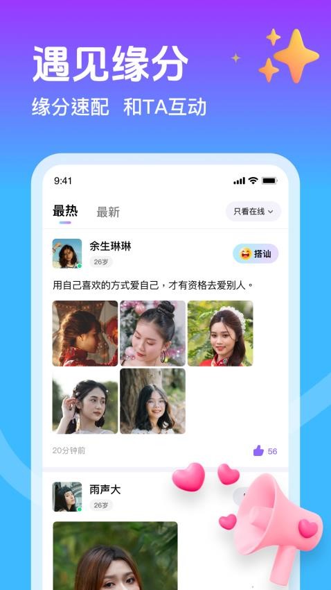蓝天下载站为您免费提供本地邂逅最新版本下载。这款专为寻找另一半打造的社交软件,汇聚海量优质单身男女,通过线上搭讪功能让用户轻松邂逅情投意合的有缘人。一键搭讪功能提升交友效率,实名认证保障安全环境,动态中心与视频通话功能丰富社交场景。本地邂逅官网版下载安装v1.0.1安卓版,致力于为用户提供真实可靠的交友体验,让生活不再孤单。