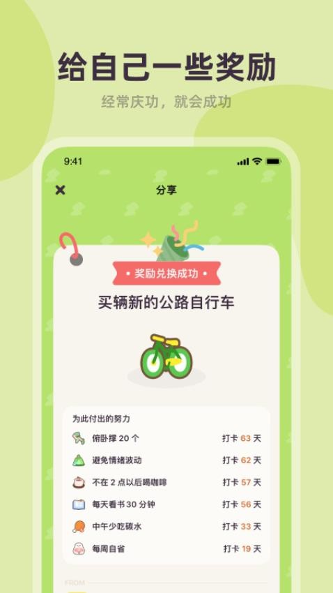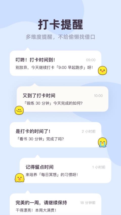 1、游戏化激励体系:将习惯养成转化为能量积累游戏,用户可通过连续打卡解锁限定奖励,系统自动计算能量兑换比例,形成正向反馈循环。 2、多维数据看板:支持生成月度习惯养成报告,包含完成率趋势图、中断周期分析、能量消耗热力图等专业数据模块。 3、智能提醒矩阵:构建三层提醒机制,包括基础时间提醒、临近时段震动提示、未完成时的语音催办功能,适配不同使用场景。 4、原创视觉系统:提供300+手绘图标库,涵盖学习、运动、健康等20个主题分类,支持自定义图标组合与动态效果设置。 5、社交激励机制:用户可生成打卡成就海报分享至社交平台,好友点赞可转化为额外能量奖励,构建习惯养成社交圈层。应用优势