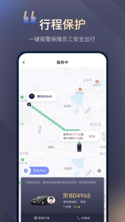 提供预算设置、里程限制、时段管控等功能,企业可实时查看用车明细,生成可视化报表,实现精细化成本管理。3、全链路安全保障