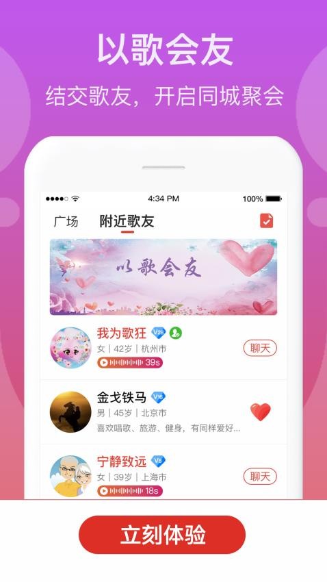 - 在「附近歌友」页面滑动查看同龄用户,点击头像可查看作品集和基本信息。