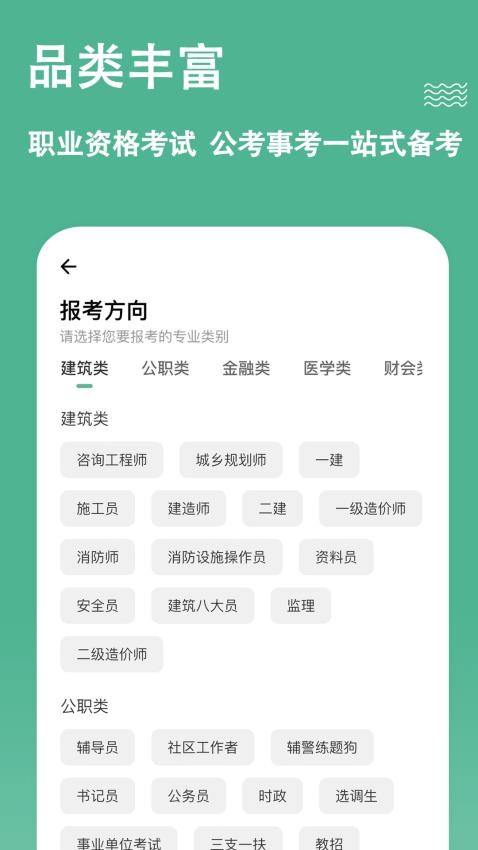 覆盖建筑、金融、医学等6大核心领域,题库总量超50万道,满足不同职业资格考试需求。专业分类细化至二级科目,用户可精准定位学习方向。