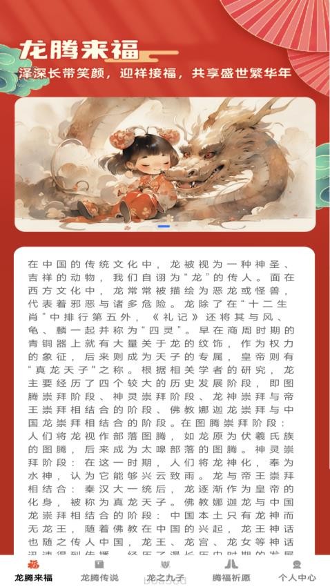 软件构建了从龙图腾起源到现代象征的完整知识框架,通过图文结合形式解析龙与中华文明的关联,帮助用户建立文化认知坐标。