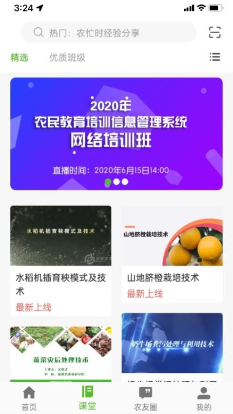 1.课堂列表:支持按作物类型、技术难度筛选课程 2.新闻资讯:聚合农业农村部官网权威信息 3.农友圈:创建私域交流群组讨论种植问题 4.点赞收藏:建立个人知识库分类管理学习内容 5.专家咨询:预约线下实地指导服务